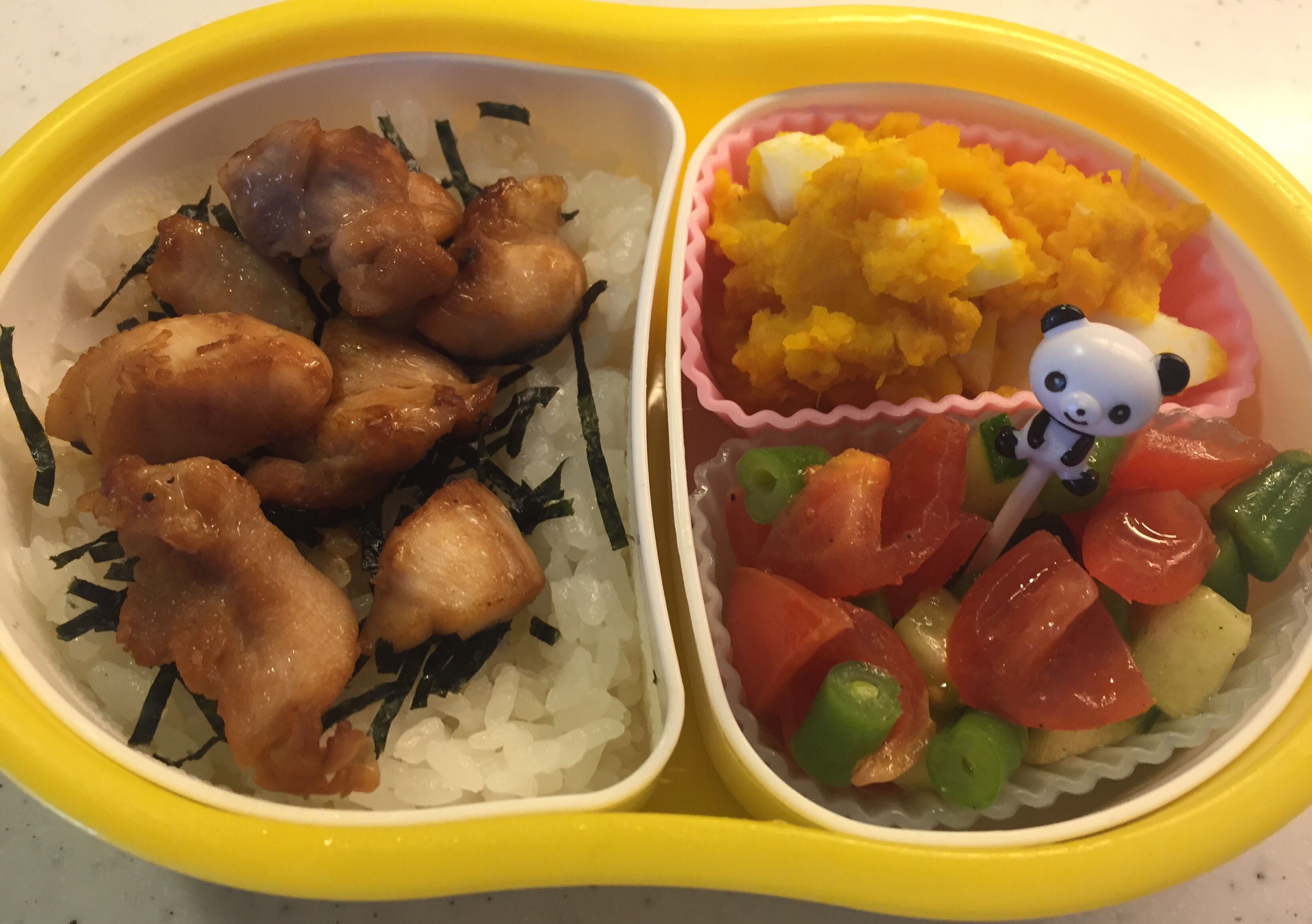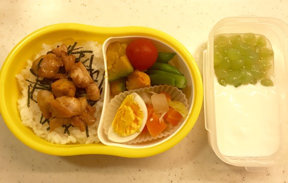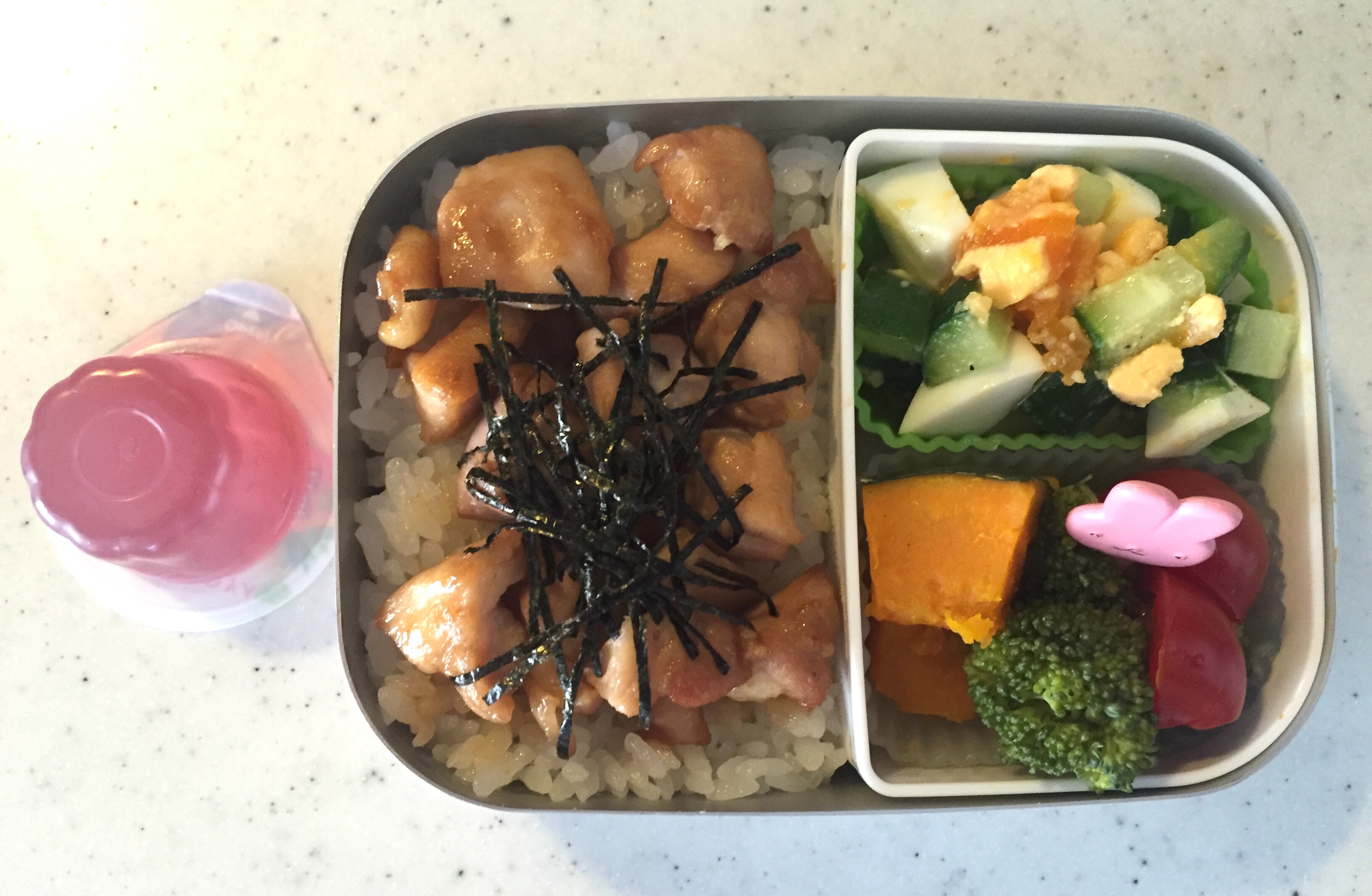Well, it takes about three minutes to make this yakitori-don if you already have your rice ready. I bought pre-cut chicken thigh (guilt), don’t even have to marinate it (another guilt), stir-fry it and quickly season at the end. Voila, it’s done (within three minutes). I just boiled egg rather than make omelet (guilt), packed it with unseasoned vegetables (guilt). On top of this, I packed frozen apple mousse and mashed sweet potato from the freezer for dessert (see, I am now officially guilty).